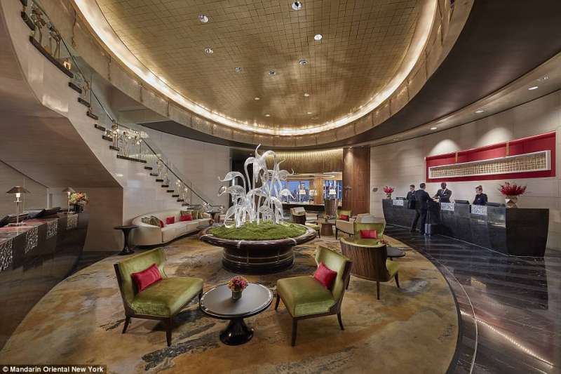 ▼紐約東方文華酒店:這間酒店的大廳位於35樓,落地窗設計非常有吸引力。大廳中央擺放著巨大的手工製玻璃花。