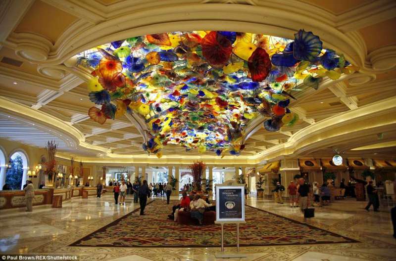 ▼拉斯維加斯百樂宮酒店:這間酒店受義大利科莫湖鎮啟發,風格突出。大廳天花板上有2000朵彩色玻璃花,這是設計師Dale Chihuly手工吹制的。