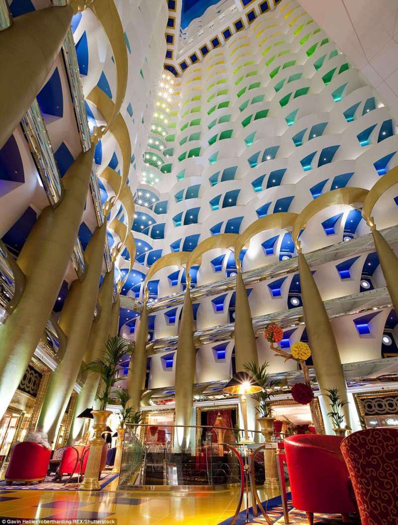 ▼杜拜阿拉伯塔朱美拉飯店:這間飯店超級奢華,各個角落都有黃金裝飾,大廳內還有大型噴泉,一抬頭就能看到五顏六色的樓層。