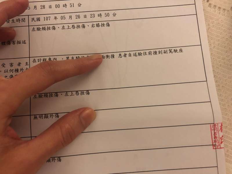 ▼翁男逼車也讓司機驟停,後座的周女因為撞擊力過大,臉和腳部都受到擦傷。這次她憤怒決定不再姑息,於是到醫院驗傷,準備向法院聲請保護令。