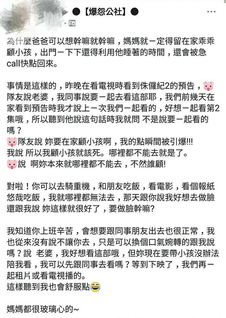 她反問:「不是說要ㄧ起看的嗎?」老公聽了竟回:「妳要在家顧小孩啊!」她瞬間被點燃怒火,罵說:「所以我顧小孩就該死,哪裡都不能去就是了?」老公還真的說:「啊妳本來就哪裡都不能去,不然誰顧?!」