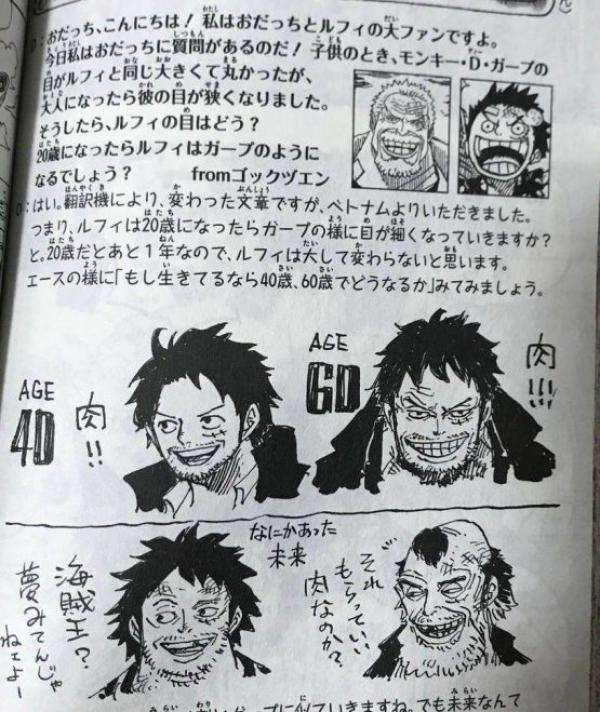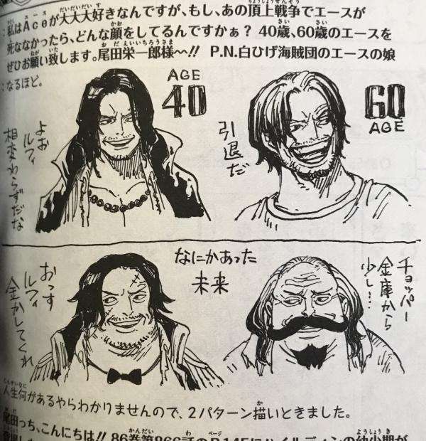 ▼在最近發行的單行本第89卷當中,竟然出現了「60歲的艾斯」,難道他還活著?原來尾田榮一郎在自問自答區,畫出了魯夫和艾斯「40歲和60歲」的模樣。特別的頹廢版非常搞笑。