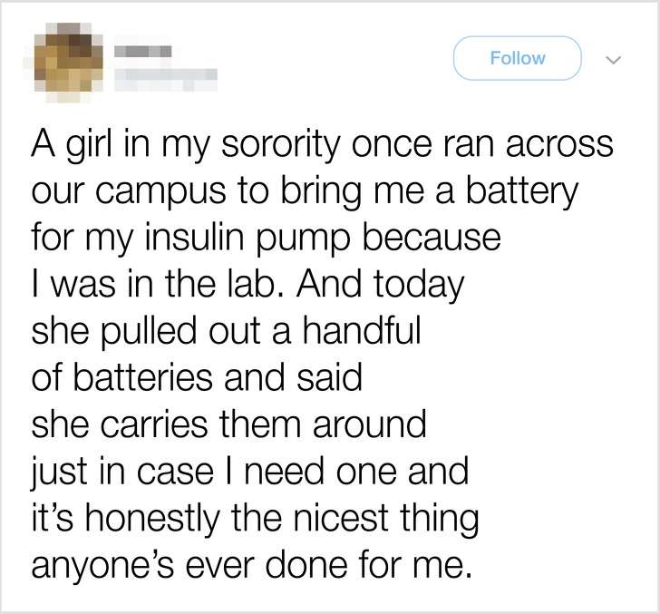 ▼「我的姐妹會上一個女生之前跑了大半個校園,將我的胰島素泵電池帶來實驗室給我,今天我發現她隨身帶了一些電池,說為了以防萬一我會用到,這真是別人對我做過最貼心的事了。」