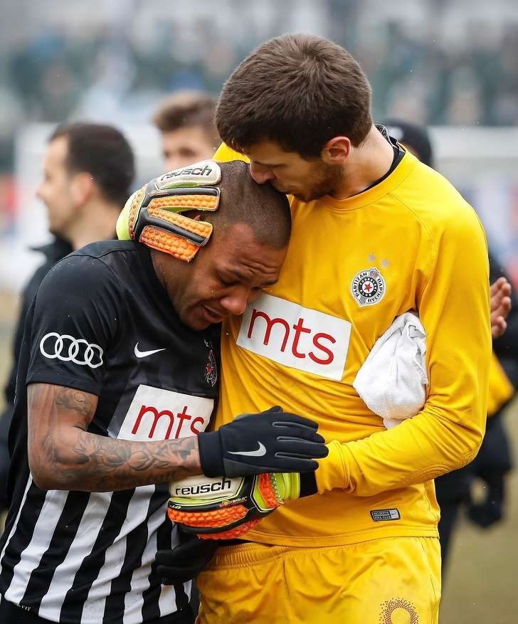 ▼貝爾格萊德游擊隊的守門員正在安慰他的隊友,因為他已經忍受了整整90分鐘來自場邊觀眾席種族主義的批評。