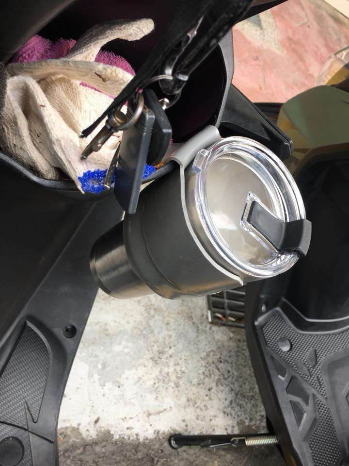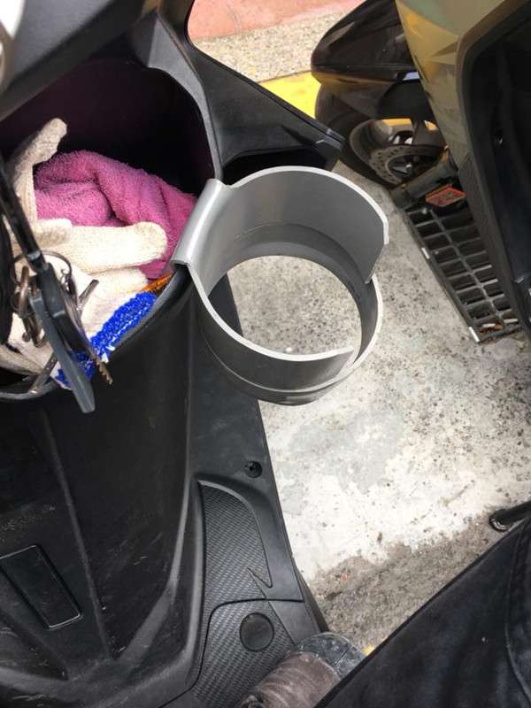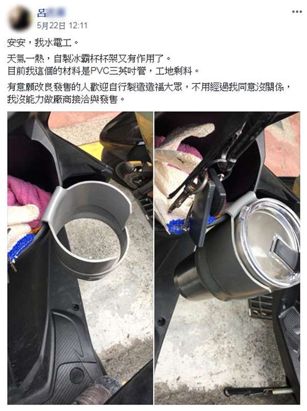 2018年06月11日夏天很多人都喜歡隨身攜帶杯子,及時補充水分,但機車騎士總是苦於杯子無處安放,日前一位呂姓水電工就自製了機車杯架,網友看到後覺得很實用,要他申請專利,還有人問「可以訂購嗎?」。