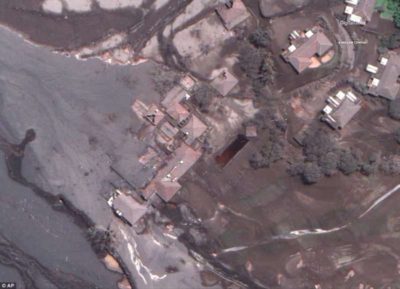 ▼火山噴發後,火山灰吞沒聖米格洛斯洛特斯村(San Miguel Los Lotes),數百房屋倒塌。比照衛星照,可以看到這座村落幾乎消失,只剩零星幾座房屋。