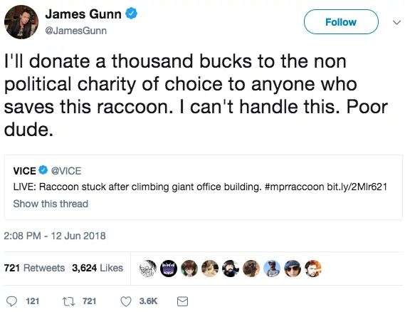 ▼這一幕讓《星際異攻隊》的導演詹姆斯岡恩(James Gunn)也忍不住在推特上表示:「我會捐出1000美元(約新台幣3萬元)給任何非政治慈善機構或任何願意拯救這隻浣熊的人。我無法接受這件事,可憐的浣熊。」