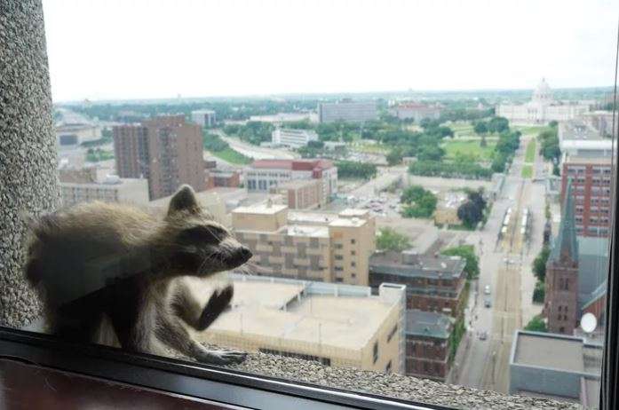 ▼有人推測由於大樓所有窗戶都是緊閉著的,讓浣熊沒有辦法進入,只能順著大樓一直往上爬。