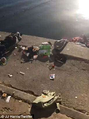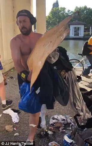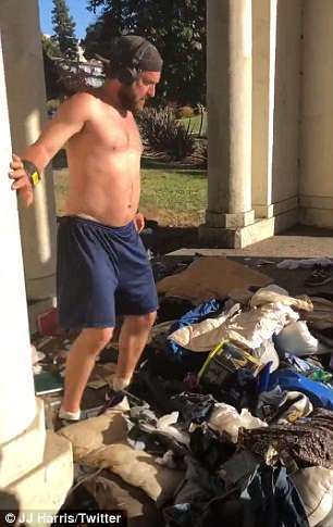 ▼不久前,Henry赤裸上身,戴著棒球帽,來到一位街友的落腳點,翻找他的隨身物品。路人看到後制止他,他卻沒有停下,不僅把街友的東西扔得到處都是,還把一些物品扔進了旁邊的湖裡。
