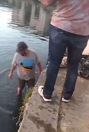 ▼後來Greg又回到湖邊,把自己扔進去的一些東西撿了回來。路人看到後拿出手機拍攝,Henry還搶奪他的手機。