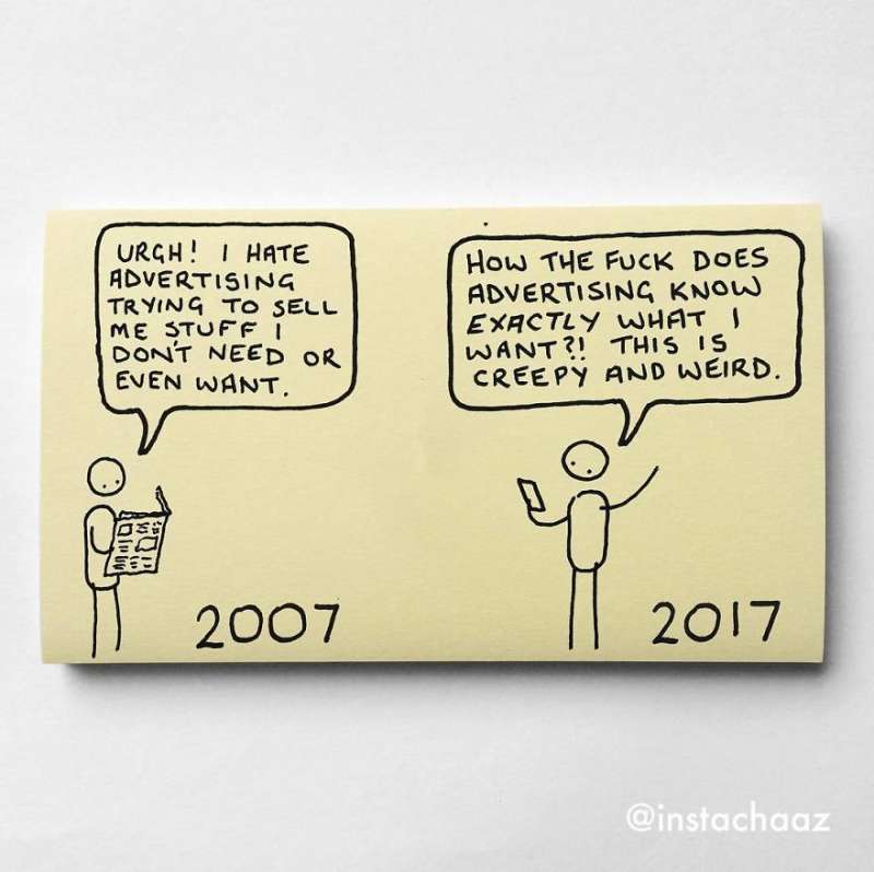 ▼2007年:廣告好討厭,都是些我不需要的東西;2017年:廣告怎麼知道我想要這個?太詭異了!