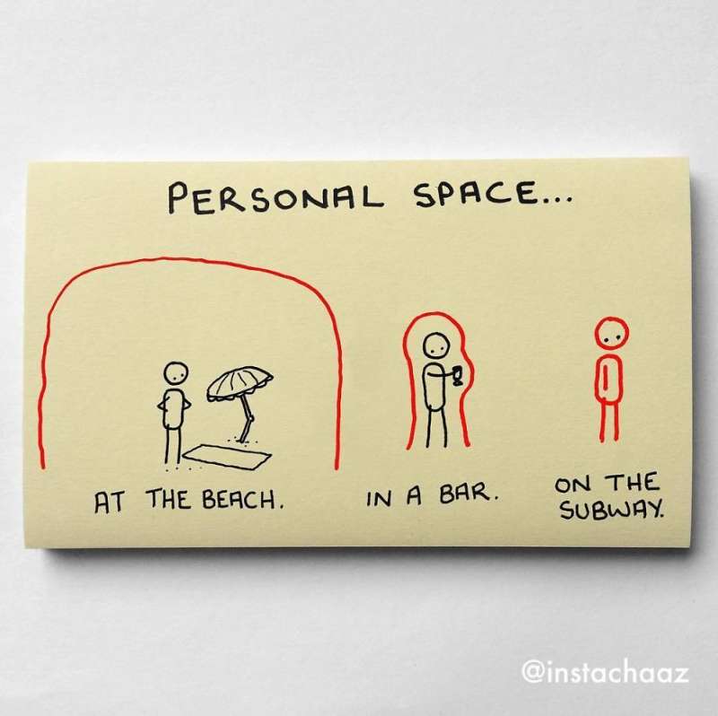 ▼個人空間:海灘很空曠;酒吧有點擠;搭地鐵時就不要想個人空間這回事啦。