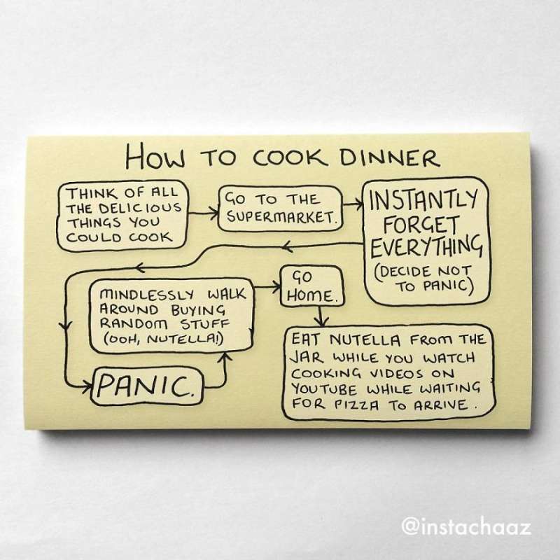 ▼怎樣煮晚餐:想好要煮什麼;去超市;通通忘掉,但要冷靜;冷靜不了,好慌張;隨便逛,隨便買,當然要買花生醬;回家;一邊吃花生醬,一邊看美食節目,一邊等披薩送到。