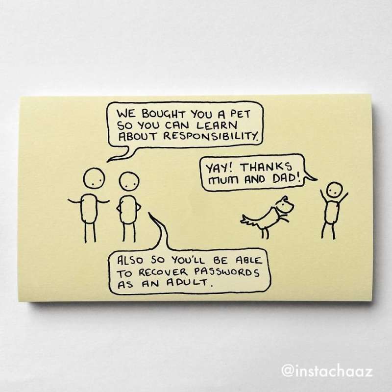 ▼爸媽:「現在有了寵物,你要有責任感,像個大人一樣,快去把wifi密碼改回來。」小孩:「謝謝爸媽!」