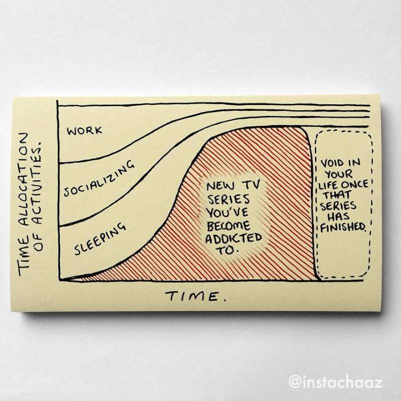 ▼把大量的時間分給了新的電視影集,哪還有時間工作、社交、睡覺啊?!