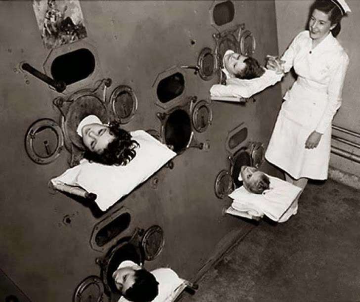 ▼在發明脊髓灰質炎疫苗之前,患者小孩都必須在這樣的「鐵肺」當中接受治療,1937年。