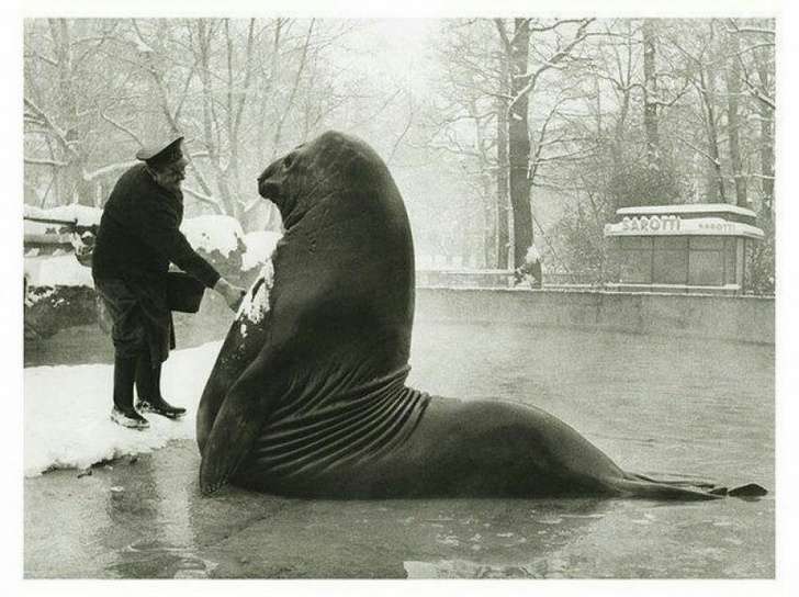 ▼柏林動物園的工作人員用雪為一隻重約1800公斤的成年海象洗澡,1930年。