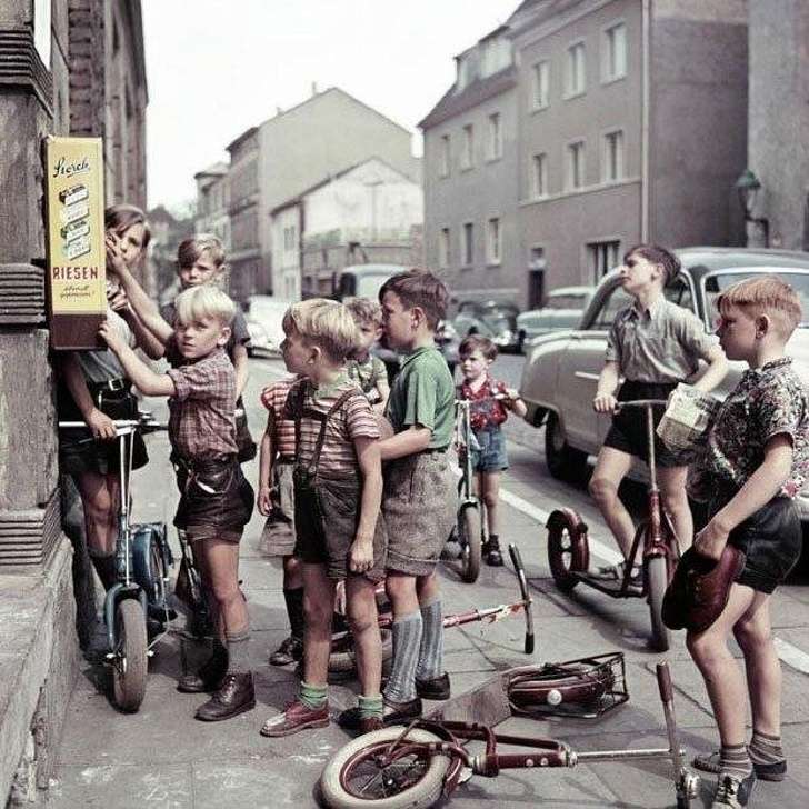 ▼一群聚集在口香糖販賣機旁邊的小孩,1955年。