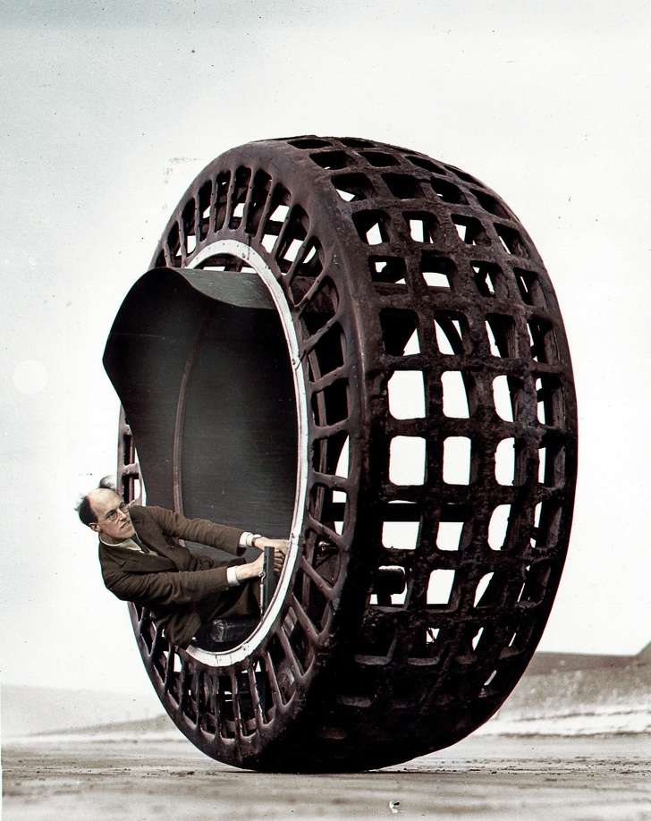 ▼J.A.普維斯(J.A. Pruves)發明的Dynasphere獨輪車,駕駛者是他的兒子,1932年。