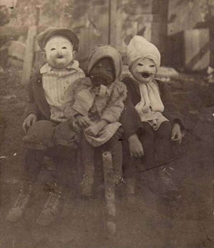 ▼3位小孩穿著他們的萬聖節服裝,1900年。