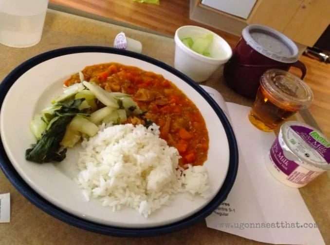 ▼馬來西亞,檳城:湯、薑黃雞肉、白飯、蔬菜、蘋果(左);菠菜湯、烤雞肉、花椰菜、吐司、馬鈴薯(右)。