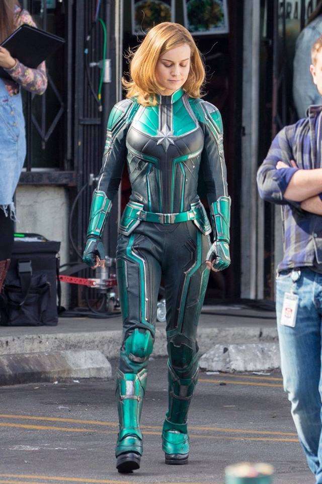 ▼布麗·拉森身穿黑色和綠色相間的制服,在片場拍攝的照片曾引發熱議。不過那應該是克里星人的制服,後期驚奇隊長會改成標誌性的紅色為主制服。
