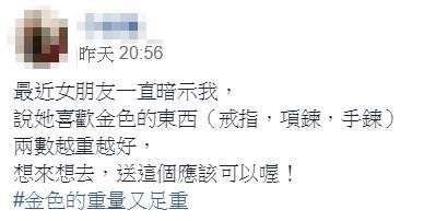 送禮要送到對方心坎裡,這可是一門學問。最近,一名男網友在臉書社團「爆廢公社」貼文,表示女友不斷暗示要禮物,並表明喜歡金色的東西,還特別交代「兩數越重越好」。他推測應該是戒指、項鍊、手鍊一類的飾品,但送這些太沒創意,他決定送一些特別的東西。