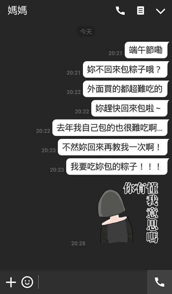 ▼原PO感嘆地說「有一種味道是想念,那是無可取代的」。還傳媽媽的賴給她說「你不回來包粽子喔?」但看著不讀不回的訊息,原PO抑制不住思念「只是想再跟媽媽任性耍賴一次…我只是想吃媽媽包的粽子…我只是想念她而已…」。