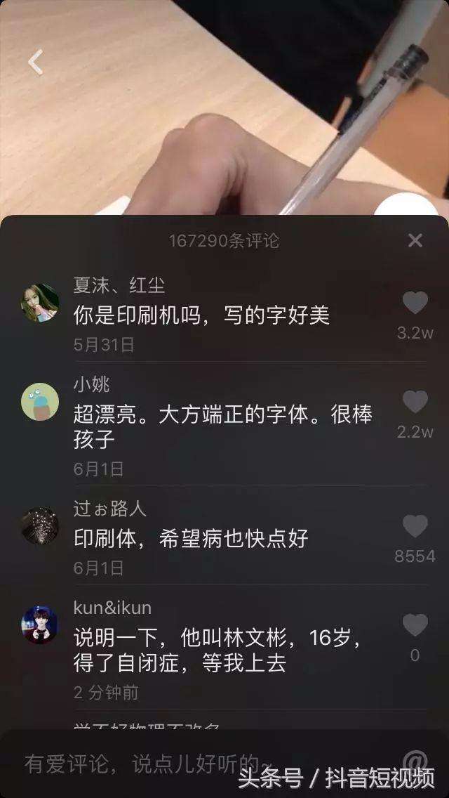 2018年06月17日能夠把字寫得漂亮、整齊並非人人可做到,但這名16歲少年林文彬寫出來的字「像電腦列印」,人人喊狂,他在影音網站《抖音》的作品引來730萬網友按讚,片中還曝光了他的畫作,一起來看看吧~