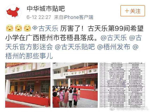 ▼不久前有網友在微博爆料「第99間『古天樂希望小學』已在廣西梧州市蒼梧縣建成。」根據媒體粗略猜想,古天樂至今至少投入1980萬元港幣(約新台幣7548萬)用來建造慈善小學。