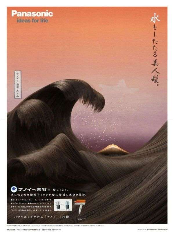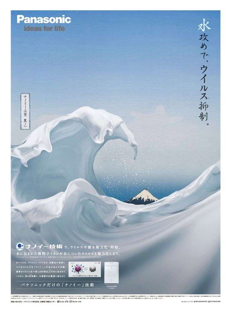 ▼Panasonic以生菜、頭髮、衣物再現出《神奈川沖浪裡》的景象,遠端也以茄子、人臉塑造成原本的富士山,藉此來宣傳冰箱、吹風機、洗衣機等商品,一眼就讓人難忘!這系列廣告也獲得第44屆日本產業廣告獎,雖然已相隔近10年,不過在最近創意又被拿出來討論了~