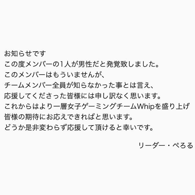 ▼日前這支日本女子電競戰隊「Whip」在官方推特上發表了一篇道歉聲明,自爆「真的很抱歉…我們最近發現其中一名成員是男性…」引起了網友們熱烈的討論。