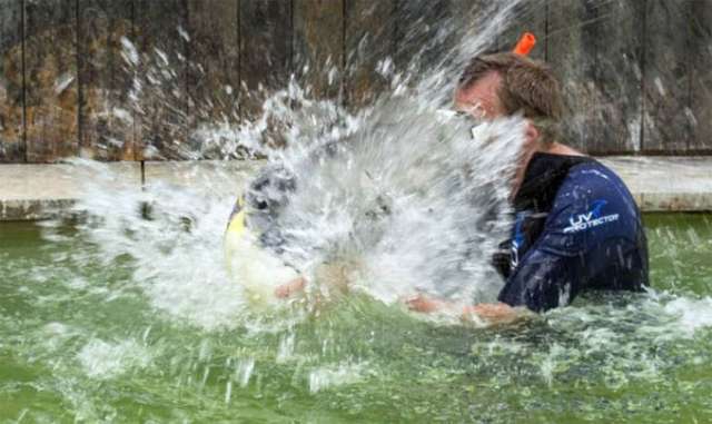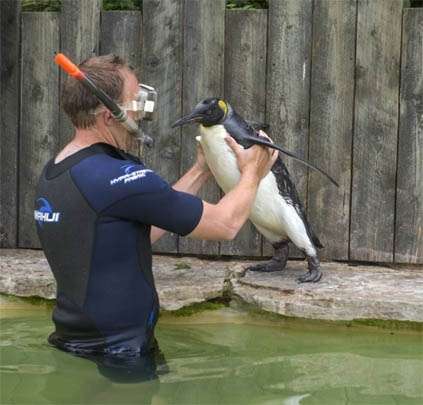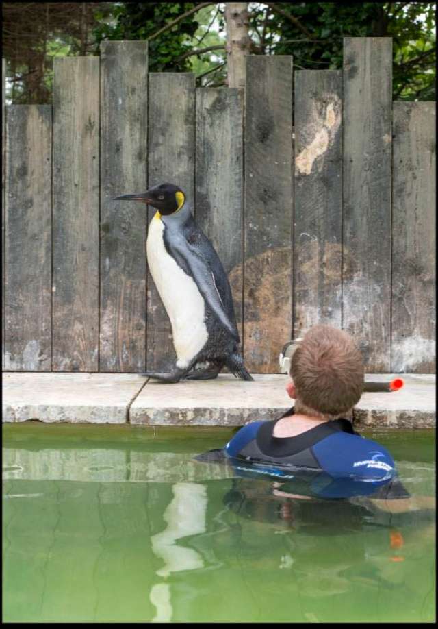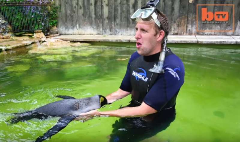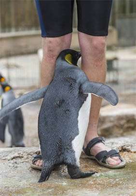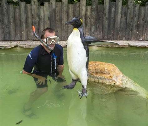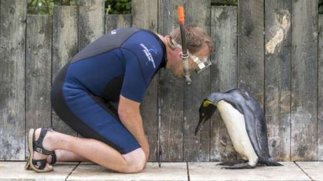 ▼在格洛斯特郡雀鳥花園出世的夏洛特(Charlotte)從小由飼養員基恩(Alistair Keen)養育,由於每天都有人餵食,所以不必親自下水捕魚,再加上沒有父母親自教導,導致夏洛特失去游泳的技能,而且還非常懼怕水。