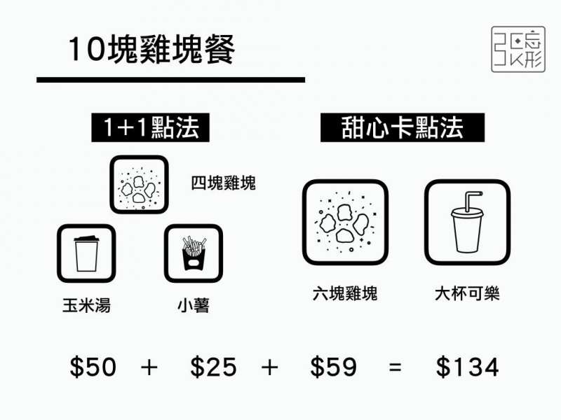 1+1點法(4塊雞塊+玉米濃湯)50元 +單點 小份薯條 25元 + 甜心卡點法(6塊雞塊+大杯可樂)59元 = 134元。