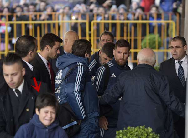▼去年時,梅西與隊友們抵達烏拉圭首都蒙特維多的一間旅館。當地的球迷知道這一消息後,早早過去圍觀,想要一睹偶像的風采。一名10歲的小球迷看到偶像後太開心,拿著手機衝了過去,想要和自己心目中的足球英雄合影,但被保全擋住,並被拖到了一邊。