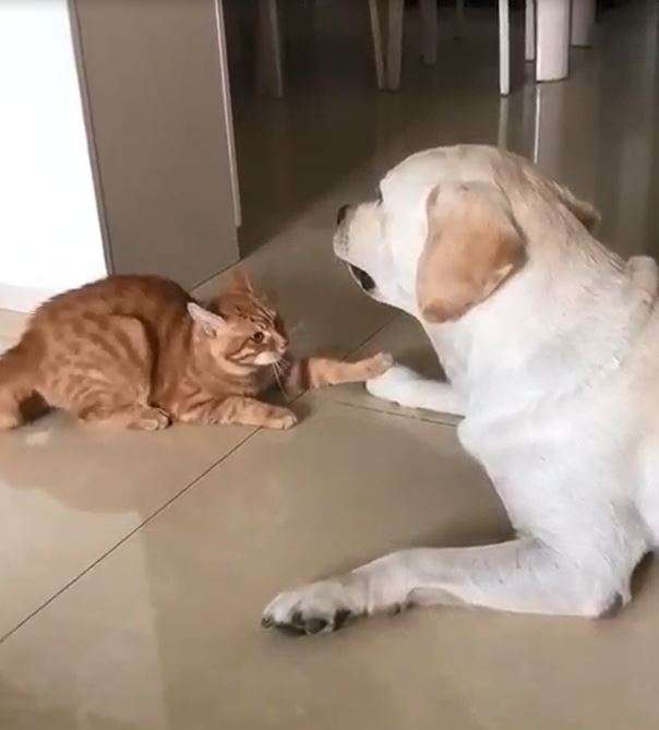 這隻貓咪太會了吧,竟然伸出爪爪與狗狗握手言和,這麼可愛誰捨得對牠生氣啊。