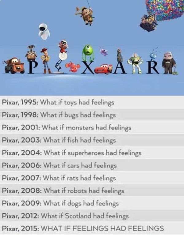 ▼「皮克斯,1995年,如果玩具有感情;1998年,如果蟲子有感情;2001年,如果怪獸有感情;2003年,如果魚有感情;2004年,如果超人有感情;2006年,如果車子有感情;2007年,如果老鼠有感情;2008年,如果機器人有感情;2009年,如果狗狗有感情;2012年,如果蘇格蘭有感情;2015年,如果感情有感情。」