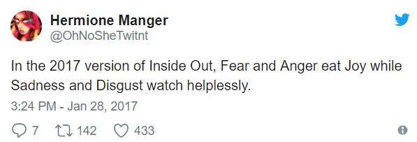 ▼「在2017年版本的《腦筋急轉彎》中,驚驚和怒怒吃掉了樂樂,而憂憂和厭厭在一旁無助地看著。」