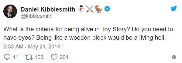 ▼「在《玩具總動員》中活著的準則是什麼?你需要眼睛嗎?像木塊一樣活著根本是地獄啊。」