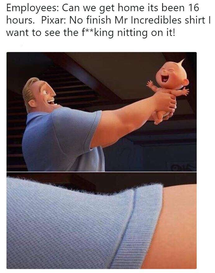 皮克斯:不,先把超能先生的上衣完成再說,我要看到上面的毛球。」