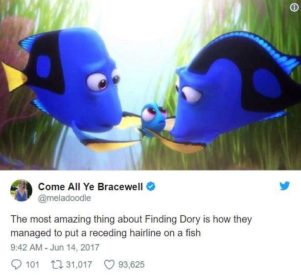 ▼「《海底總動員2:多莉去哪兒?》最神奇的細節是,他們把後移的髮際線放在了一條魚身上。」