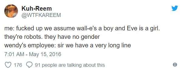 ▼「天啊,我假定瓦力是男生,伊芙是女生,但它們是機器人,應該是沒有性別的。結果速食店店員:『先生,後面還有很多人在等喔。』」