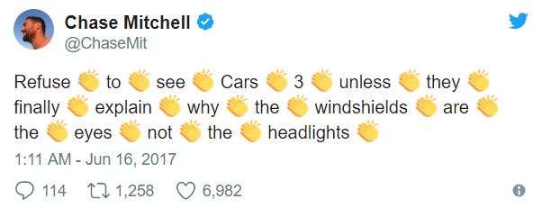 ▼「絕對不看《Cars 3:閃電再起》,除非他們解釋為什麼車子的眼睛是擋風玻璃,而不是前照燈!」