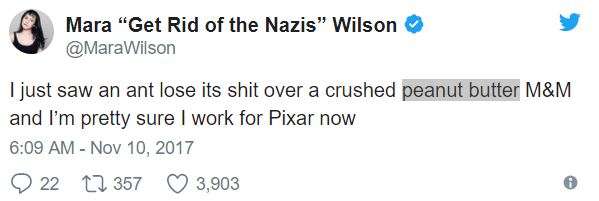 ▼「我剛剛看到一隻螞蟻因為被一顆花生醬M&M壓爆而對世界失去希望,我很確定現在我正為皮克斯工作。」