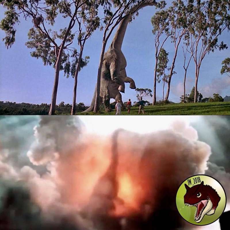 ▼導演J.A. Bayona稱,這一幕是向第一部《侏羅紀公園》致敬,在第一部中,腕龍是第一個被發現的恐龍,配合誇張的配樂預示著恐龍世界的誕生,而《侏羅紀世界:隕落國度》中腕龍隨著火山爆發灰飛煙滅的畫面,作為一種呼應,宣告了25年前開始的恐龍世界的結束。