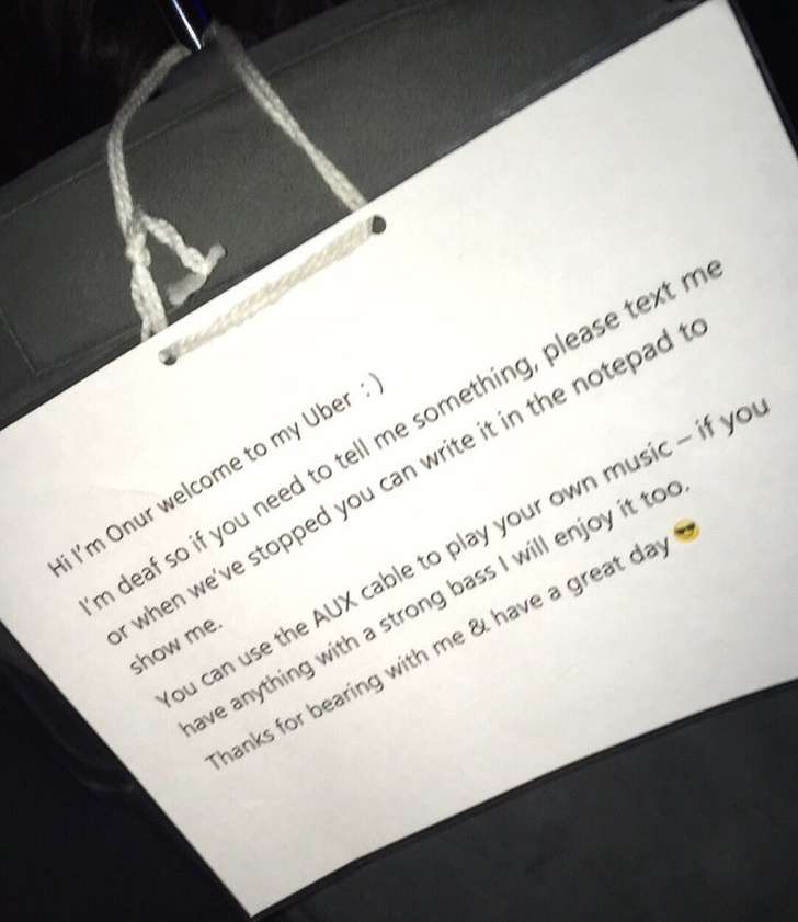 ▼Uber司機:「你好,我是Onur,歡迎搭乘我的Uber。我聽不見,如果你有想說的話,請傳訊息給我,或是在我停車時寫在筆記本上拿給我看。你可以直接用音響播放你的音樂,如果你放的是重低音我也會很享受的。謝謝你對我有耐心,祝你過得愉快。」