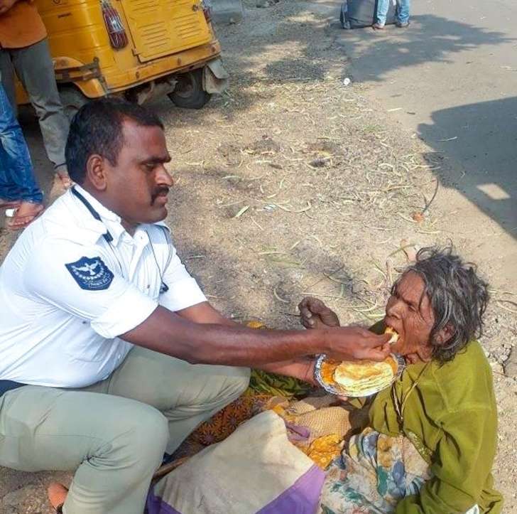 ▼這位流浪老太太身體虛弱,沒辦法自己進食,印度一位交通警察主動餵她吃東西。