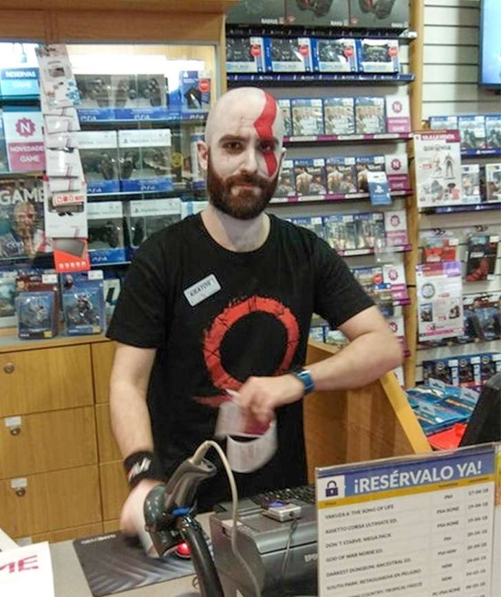 ▼這間店的員工打扮成了《戰神》主角Kratos的模樣。