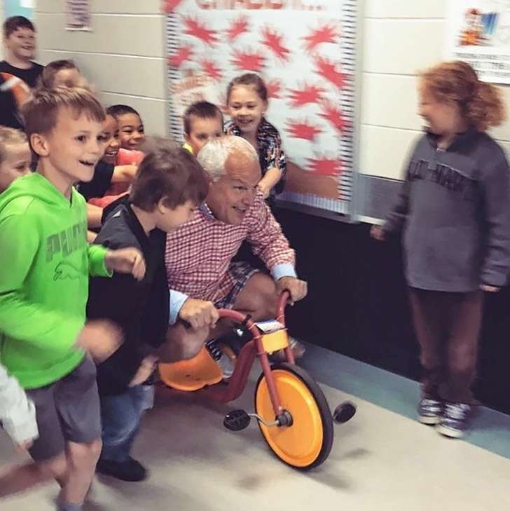 ▼「我爸是學校校長,他在學校和學生們挑戰閱讀時間累積1000分鐘,獎賞就是可以讓他穿超不搭的衣服,騎著三輪車,在走廊上被推著走。」