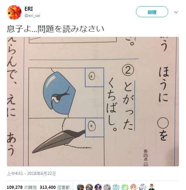 媽媽PO出兒子的小學題目「請圈出尖的鳥嘴」 大公司一看就搶著要人